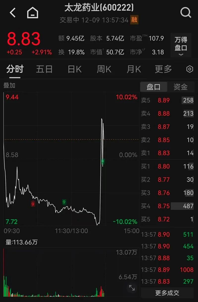 12月9日,太龙药业 开盘 涨停后下挫,午后盘中一度触及跌停,上演“天地板”。随后 该股再度拉升, 截至发稿, 太龙药业 涨近3%,报8.83元。