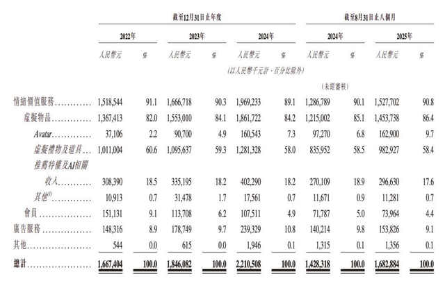 收入来源过度集中是显著特征。2025年前八个月,其情绪价值服务(主要包括虚拟物品和会员特权)营收达15.28亿元,占总营收的90.8%;而广告服务收入仅为1.54亿元,占比9.1%。这种业务结构虽然带来了高毛利(报告期内毛利率保持在80%以上),但其抗风险能力相对脆弱。