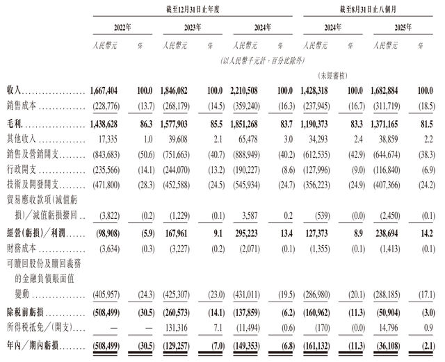 招股书披露的财务数据展现出稳健的增长态势。2022年至2024年,Soul分别实现收入16.67亿元、18.46亿元及22.11亿元,复合年增长率超过15%。2025年前八个月,其收入达到16.83亿元,较2024年同期的14.28亿元增长17.86%。