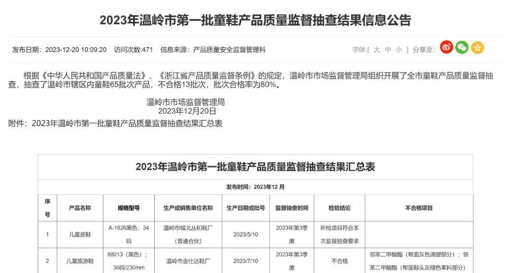 2023年温岭市第一批童鞋产品质量监督抽查结果信息公告