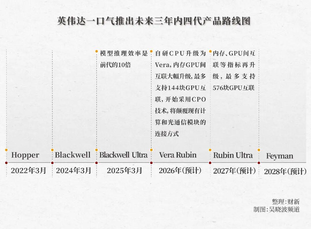 而布莱克威尔(Blackwell)也将很快让出一号位,在今年英伟达公布的未来芯片路线图里,未来三年里,鲁宾(Rubin)、费曼(Feyman)将陆续登场。