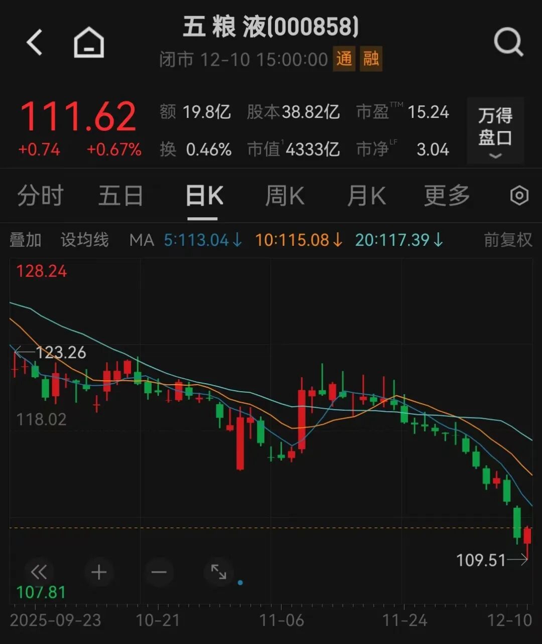 截至今日收盘,五粮液涨0.67%,报111.62元,总市值4333亿元。