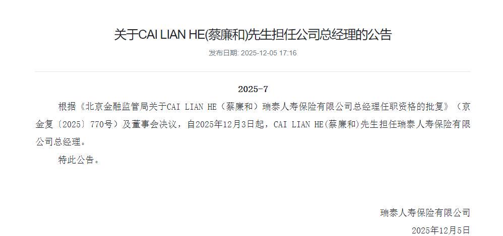 2024年7月,蔡廉和从汇丰人寿跳槽至瑞泰人寿,接替此前由副总经理陶耀辉代理的公司负责人职责。据媒体报道,蔡廉和系瑞泰人寿外资股东南非耆卫集团提名聘任,拟任公司总经理,特殊原因其任职资格于2025年12月5日获监管核准。这意味着加入公司一年后,其身份也从此前的副总经理正式切换为总经理。