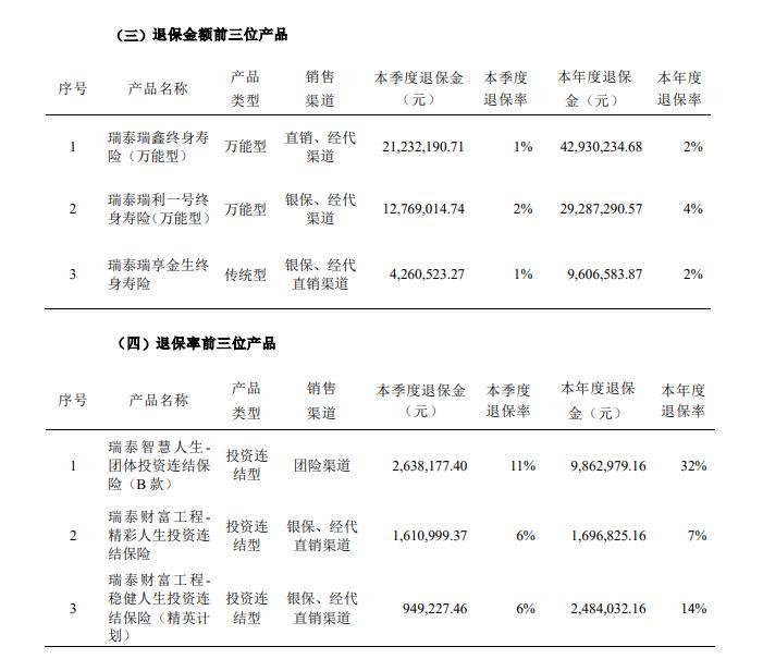 退保率最高的是瑞泰智慧人生-团体投资连结保险(B款),三季度退保率11%,前三季度退保率32%;其次是瑞泰财富工程-稳健人生投资连结保险(精英计划),退保率三季度为6%,前三季度为14%。