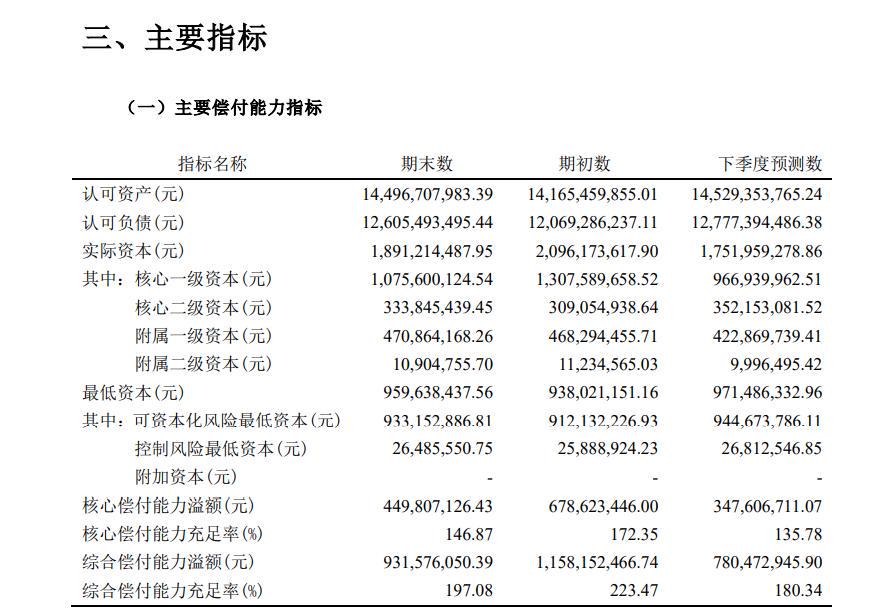 截至2025年第三季度末,瑞泰人寿综合偿付能力充足率及核心偿付能力充足率分别为197.08%、146.87%,较上季度末环比下降26.39个百分点和25.48个百分点,较2024年末分别减少55.78个百分点、49.21个百分点。而公司预计综合偿付能力充足率及核心偿付能力充足率在下季度继续下降,分别为180.34%、135.78%。