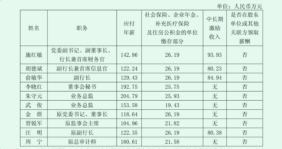 其中,党委副书记、副董事长、行长兼首席财务官施红敏应付年薪142.86万元,社会保险、企业年金、补充医疗保险及住房公积金的单位缴存部分26.19万元,中长期激励收入93.93万元,薪酬合计262.98万元,副行长兼首席信息官228.66万元,副行长俞敏华240.56万元,原副行长汪明228.92万元。
