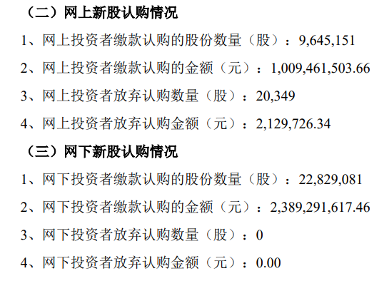网下投资者缴款认购的股份数量为2282.91万股,缴款认购的金额为23.89亿元,放弃认购数量0股。网上、网下投资者放弃认购的股数全部由保荐人(主承销商)包销。