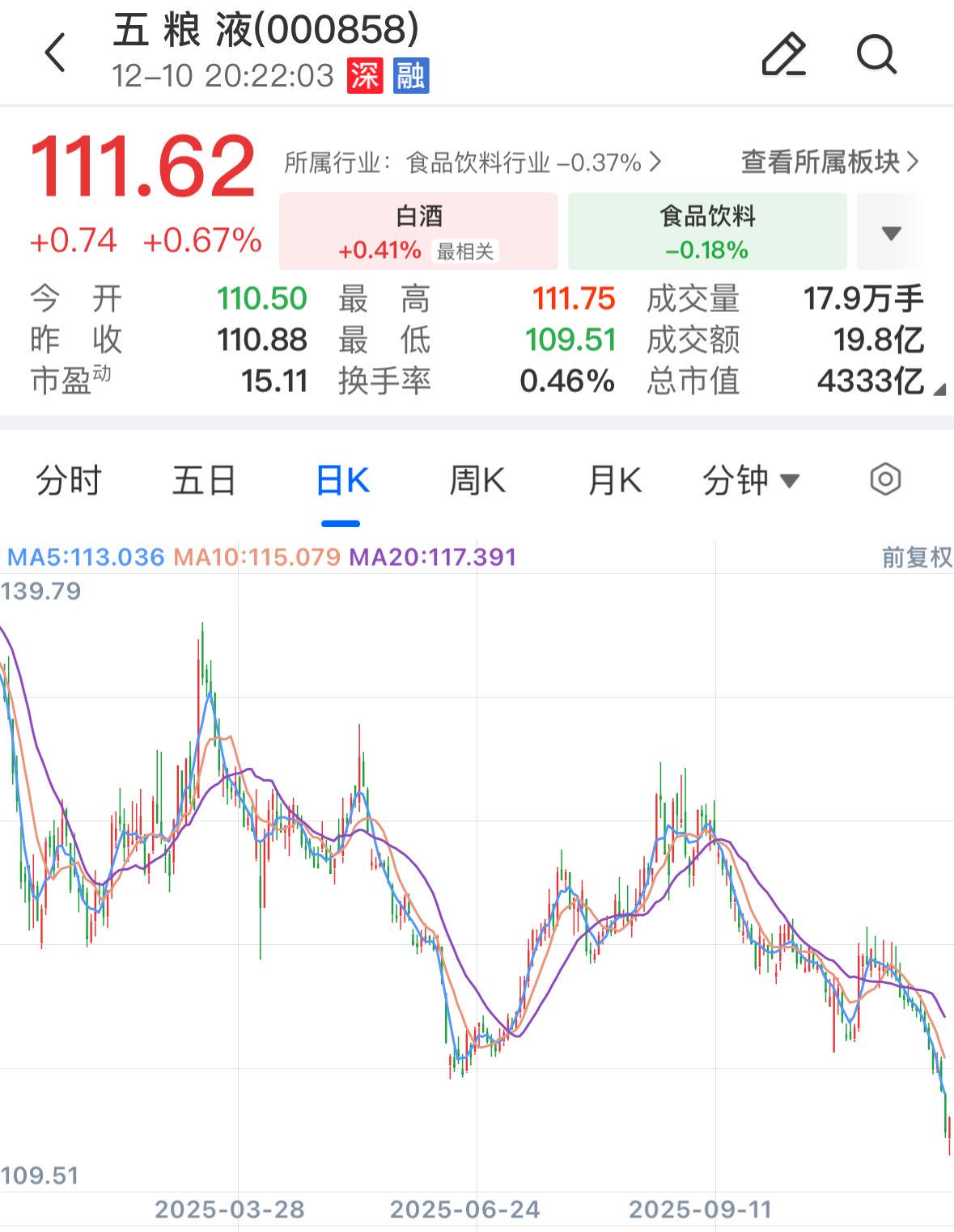 五粮液今日股价盘中创出新低,最新收盘价报111.62元,总市值4333亿元,今年股价累计下跌16.89%。