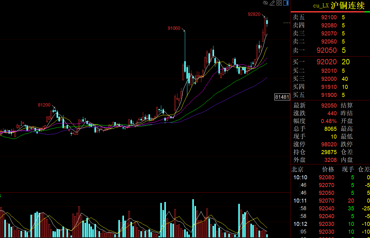 国内市场的铜期货价格同样不甘示弱,以上海期货交易所的沪铜主连合约为例,其价格从 2025 年4月的7万元/吨附近,一路震荡上行,截至发稿已摸高92820元/吨,上涨势头强劲。