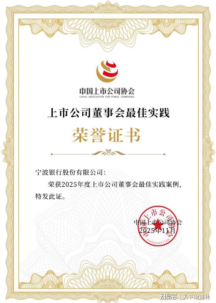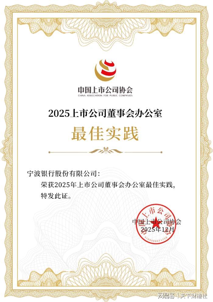近日,中国上市公司协会三项重磅年度大奖评选结果出炉,宁波银行凭借在公司治理与证券事务工作中的卓越表现,喜获2025年“上市公司董事会最佳实践”和“上市公司董办最佳实践”及“上市公司董事会秘书履职5A评价”三大殊荣。