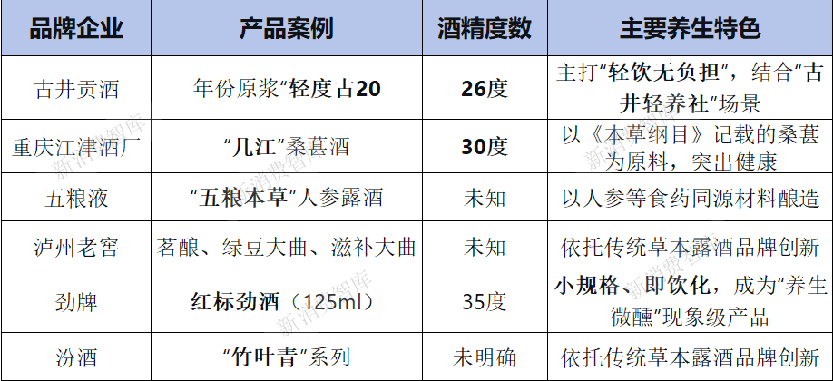 义古井贡酒推出的“古20”为例,其将酒精度设定为26度,吸引了大量年轻群体尤其是女性消费者,新消费智库通过检索发现,至少发现接近10款走向低度化含有养生概念的酒,其中不乏知名白酒品牌: