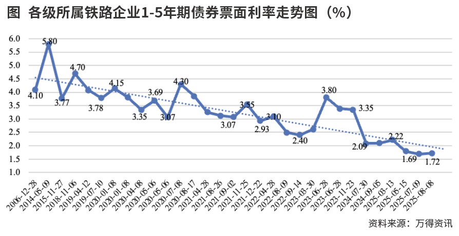 发行票面利率波动走低。2019年至2025年9月末,国铁集团5年期、10年、30年期债券发行票面利率下降170个基点左右,随市场利率下行,期限利差明显收窄,各级所属企业1至5年期债券发行票面利率从4%以上降至1.7%左右,降幅约230个基点。