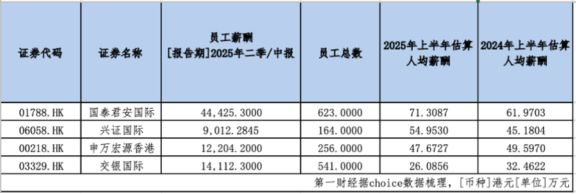 尽管工作质量承压,行业的薪酬热度却未减。第一财经基于Choice数据及2025年中期报告进行的估算(注:若未公布最新员工总数,则采用去年末数据),部分在港拆分上市中资券商人均薪酬呈现明显波动。其中,国泰君安国际的人均薪酬从61万港元上涨至71万港元,兴证国际的人均薪酬从45万港元上涨至54万港元。而申万宏源香港、交银国际则有小幅下滑。