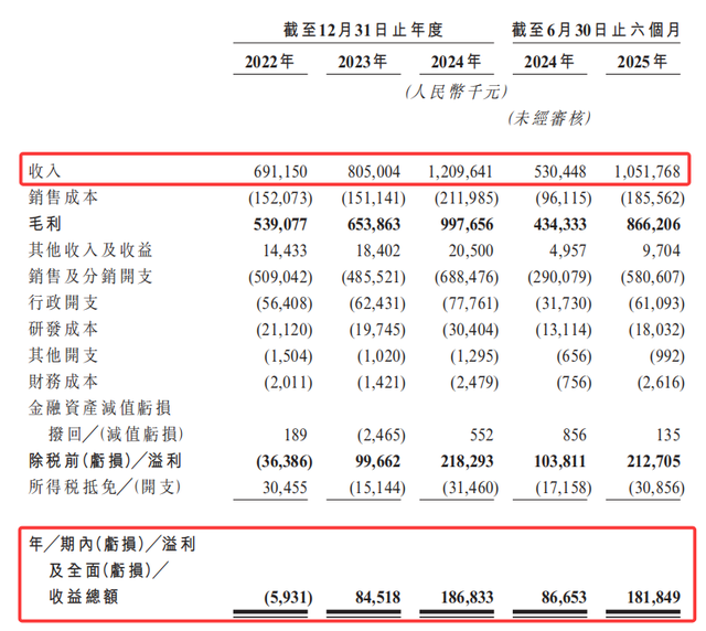 近年来,林清轩业绩增长迅速。招股书显示,2022年至2025年6月末,公司实现营收分别为6.91亿元、8.05亿元、12.1亿元和10.52亿元;同期净利润分别为-593.1万元、8451.8万元、1.87亿元和1.82亿元。不难看出,2025年上半年的净利润已逼近2024年全年水平。