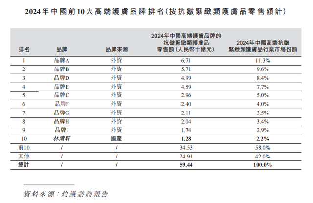 根据灼识咨询的数据,林清轩也是2024年国内Top10高端护肤品牌中唯一的国产品牌,