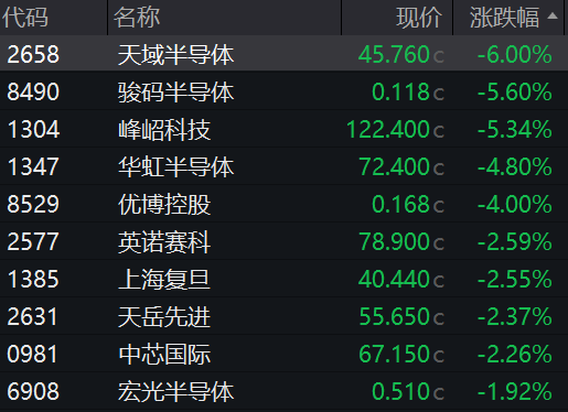 半导体板块大跌,天域半导体跌6%,华虹半导体跌近5%,中芯国际、上海复旦跌超2%。