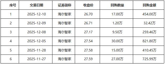 12月10日,海尔智家发布公告称,公司于当日回购A股股份17万股。据统计,这已是近一个月以来公司的第6次股份回购。