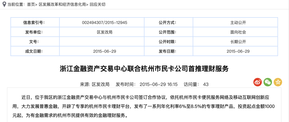 2015年6月,杭州市民卡有限公司还与浙金中心合作,在杭州市民卡公众号上线了惠民理财专区(注:杭州市民卡是由杭州市人民政府授权发放的集成卡,可以用于社会事务办理和日常消费),为580万杭州市民提供年化收益率6%-8.5%的专享理财产品。