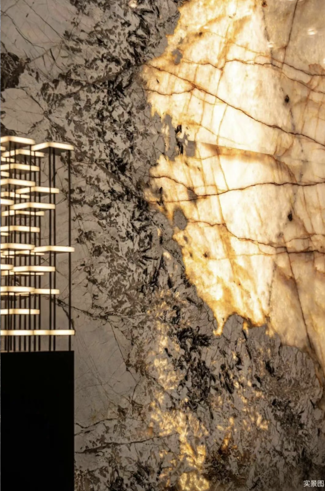 美盛不计成本地搜罗全球珍稀石材:从文体中心地面铺设的巴西海浪石,到墙面铺砌的整幅百万级伊朗青玉,再到园林中意大利雪山飞狐、普拉达绿等奢石与罗汉松、铁冬青等名贵植被交相辉映,每一寸都散发着金钱与艺术的味道。(下为实景图)