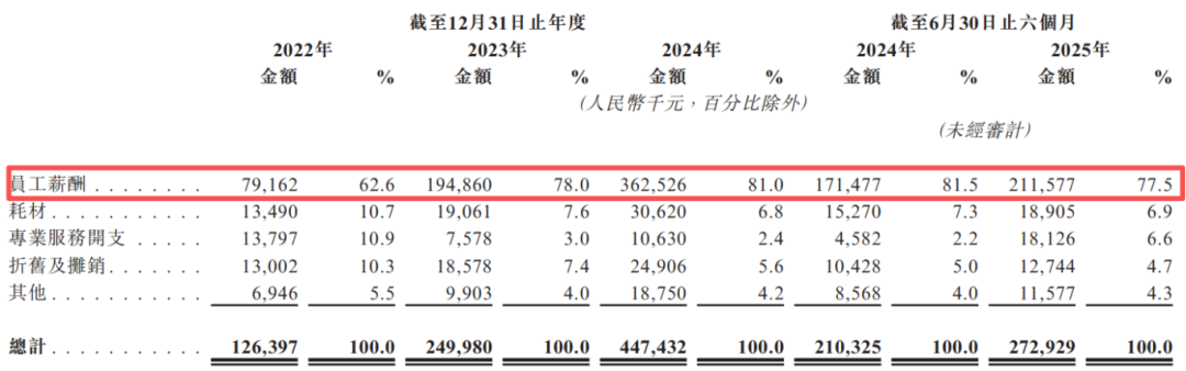 另外,2023年至2025年上半年,员工薪酬占研发开支总额均在七成以上,反映公司研发活动大量依赖工程师团队,而非重资产设备投入。