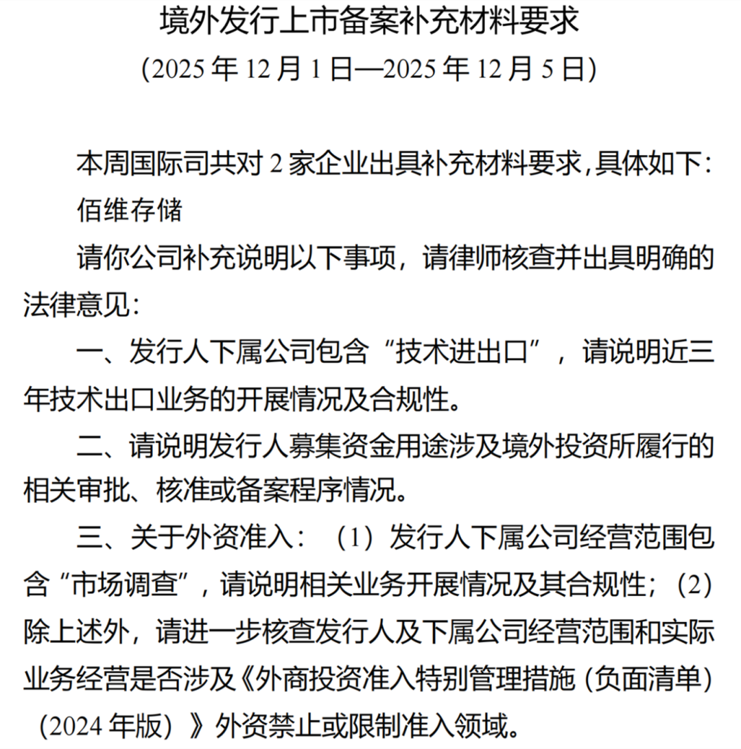 12月6日,中国证监会国际司披露对佰维存储出具补充材料要求,涉及技术进出口、募集资金用途相关和外资准入问题。