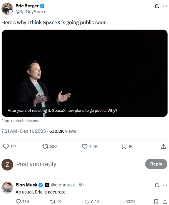 12月11日,埃隆·马斯克证实了旗下太空探索技术公司SpaceX即将上市的消息。科技媒体Ars Technica太空行业记者埃里克·博格(Eric Berger)在社交媒体X上分享了一篇文章,其中提到Space X计划明年通过首次公开募股筹集数百亿美元资金(IPO)。其后,马斯克在评论区回复称“和往常一样,埃里克的判断很准确”。