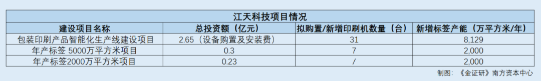 换言之,江天科技的建设项目中,“年产标签5000万平方米项目”于2023年通过环评审批并于2024年竣工并投入试生产。该项目总投资额3,000万元,新增印刷机7台(1台备用),建成后新增标签年产能2,000万平方米。而“2000万平方米标签项目”于2025年申报环评审批,总投资额为2,300万元,建设完成后可新增年产标签2,000万平方米产能。