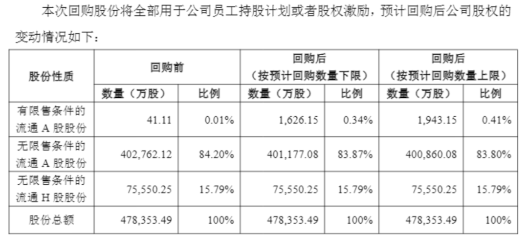 据公告,按照回购资金上限12亿元、回购A股股份价格上限63.09元/股测算,公司本次回购股份数量约为1902.04万股,约占公司目前总股本的0.40%。具体回购股份的数量以回购期满时实际回购的股份数量为准。本次回购期限自董事会审议通过本次回购方案之日起12个月内。