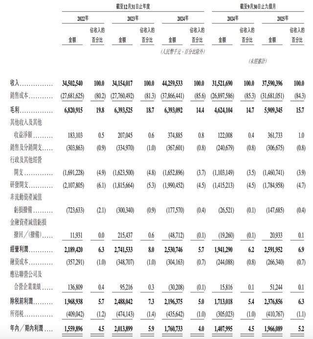 营收方面,2022年至2024年及2025年前三季度分别为约345.03亿元、341.54亿元、442.6亿元和375.9亿元。其中2023年营收同比微降1%,2024年大幅反弹增长约29.6%,而2025年前三季度增速又放缓至约19.3%。