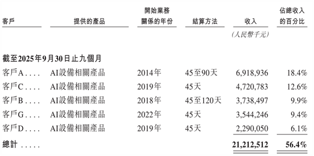 此外,客户集中度是另一个显著特征与风险点。报告期内,公司前五大客户贡献的收入分别为169.47亿元、177.67亿元、247.93亿元和212.13亿元,占总收入比例从49.1%逐年上升至56.4%。其中,对最大客户的销售占比分别为24.4%、24.2%、22%及18.4%。