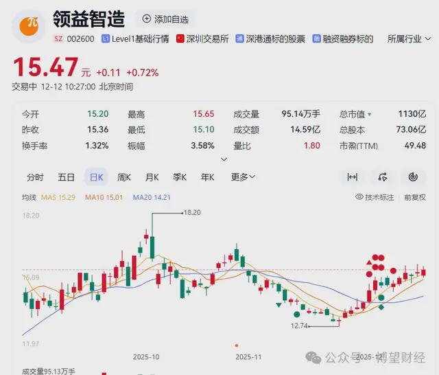 资本市场方面,截至发稿前,领益智造A股报收15.47元/股,总市值超1130亿元。