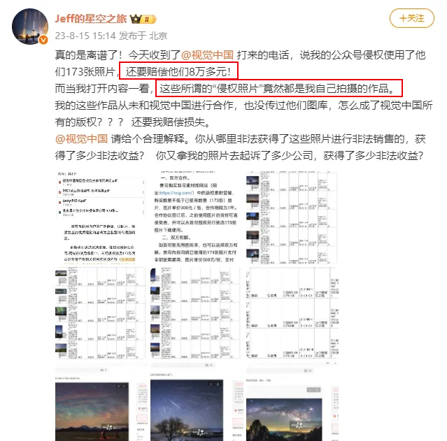 据悉,2023年8月,视觉中国通过邮件和电话联系戴建峰,称其公众号使用的173张照片涉嫌侵权,并要求戴建峰赔偿8万多元。戴建峰经核实发现,所谓“侵权照片”均为自己拍摄的作品,且从未与视觉中国合作或授权其使用。因此戴建峰反将视觉中国告上了法庭。