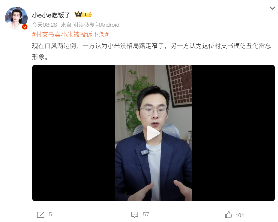 目前网上的舆论分成两种,支持小米的网友认为村支书在视频中模仿雷军发言的形式状态,丑化了雷总形象。另一方则认为农产品销售借用知名企业家演讲风格属于创意营销范畴,并无恶意抹黑,小米没格局将路走窄了。
