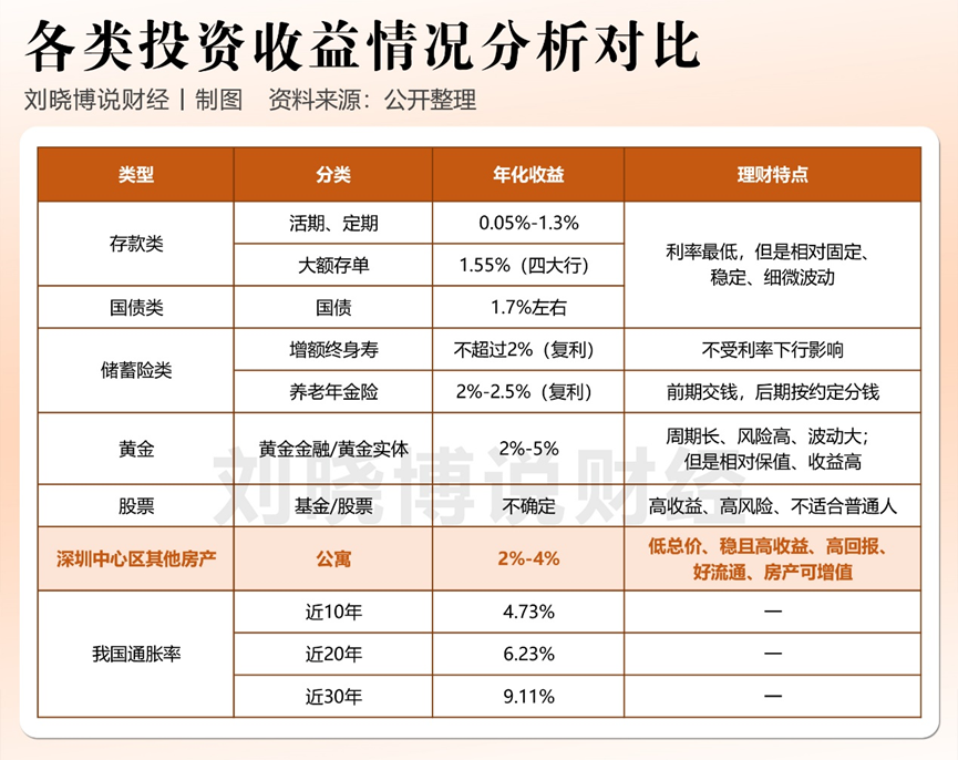 如下面数据所示,核心地段的商务公寓,其租金回报率不仅是住宅的两倍,更能跑赢存款、国债、保险和黄金。