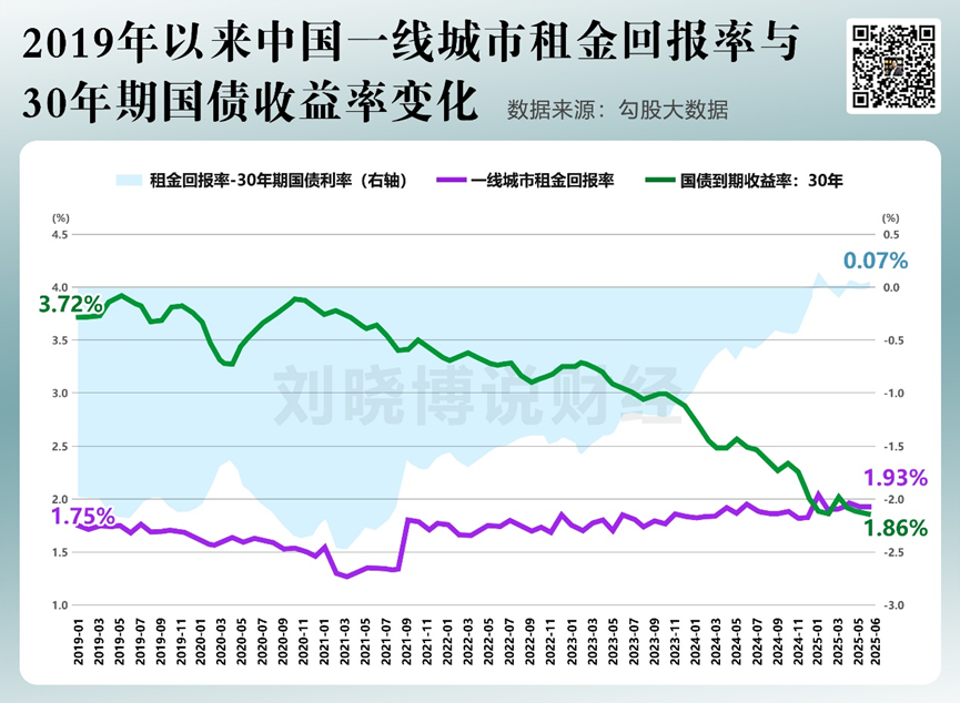 截至2025年6月,中国一线城市平均租金回报率(1.93%)罕见超越30年期国债收益率(1.86%)7个BP,意味着一线城市房产的现金流价值开始首次跑赢了无风险收益。