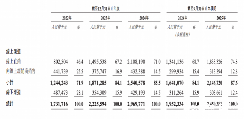 对比上述收入和净利润的同比增速,销售及经销开支的增速可谓是不相上下。从其占总收入的比例来看,从2023年开始,其占比一直维持在50%以上,并且呈占比扩大的迹象。而回看线上渠道贡献的营收占比,也是从2023年开始突然飙升至八成以上的。