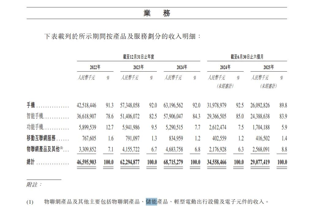 根据传音控股在港交所递交招股书,除了手机业务以外,该公司还有物联网产品及其他业务,包括物联网产品(便携式计算机及平板计算机、智能手表、智能音频设备、数码配件、家用电器等)、储能产品(混合逆变器、锂电池模块、集成储能系统、光伏模块等)、轻型电动出行设备(两轮电动车、三轮电动车)。