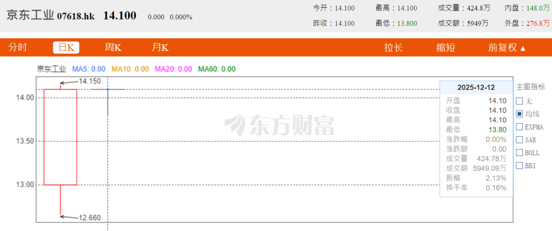 12月12日更微妙,京东工业开盘下探后继续收平,股价在14.10港元稳如老狗。但这一天成交额急剧缩水,跌至5949万港元。