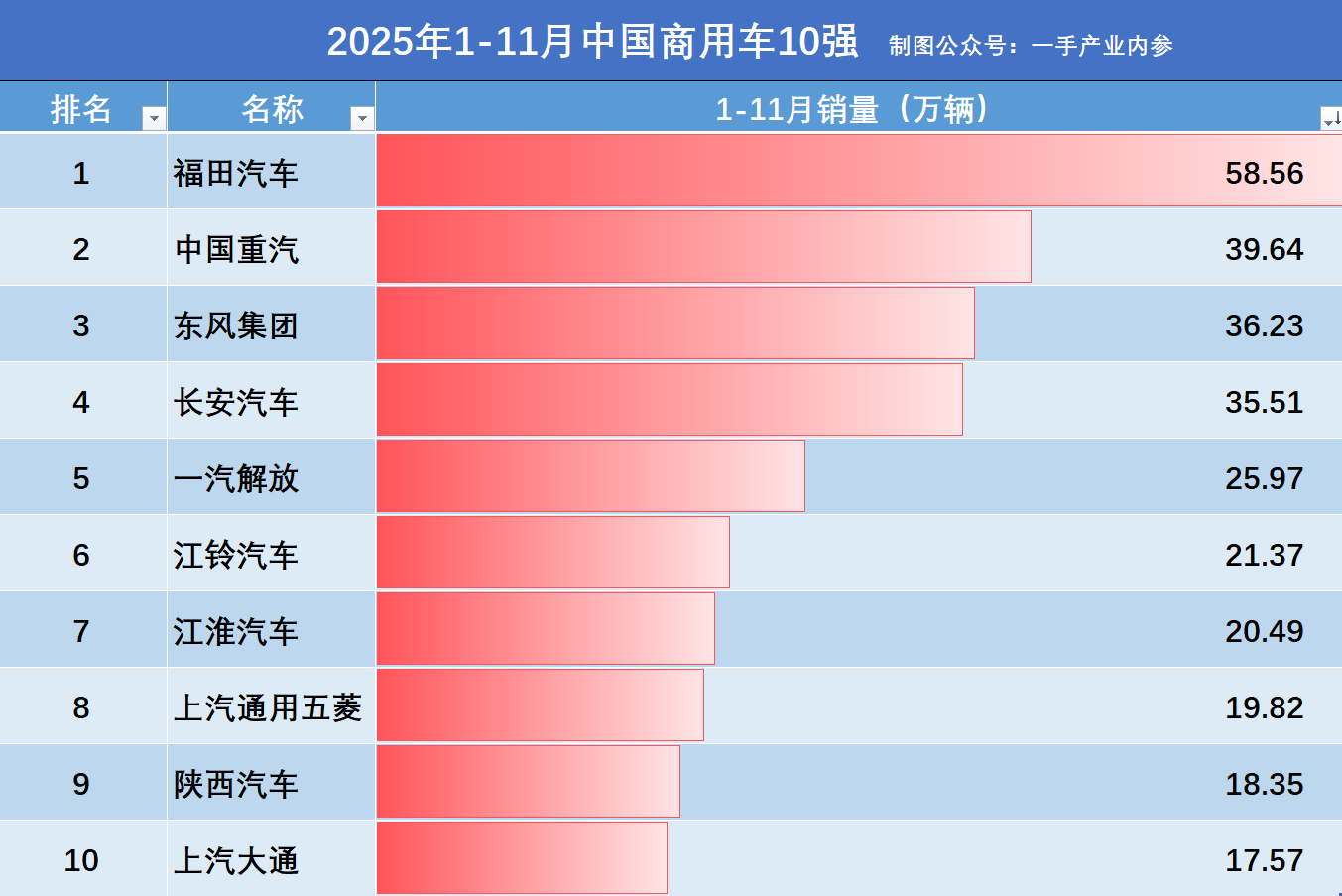 另附:2025年1-11月中国商用车销量10强厂商名单,数据源于:中汽协商用车专业委员会。