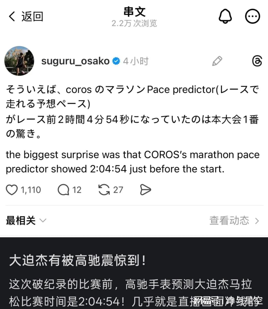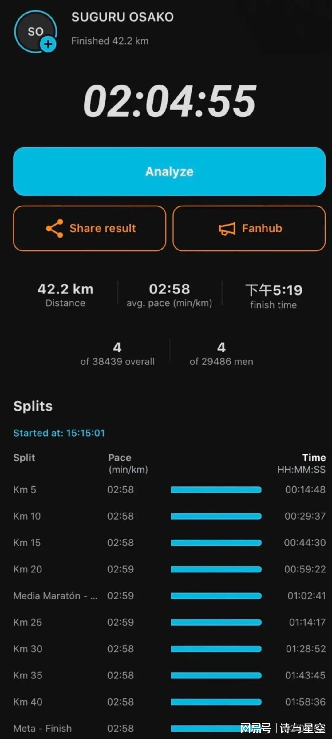 大迫杰的瓦伦西亚马拉松成绩是2小时04分钟55秒,而高驰跑表给出的预测是2小时04分钟54秒,几乎一模一样!