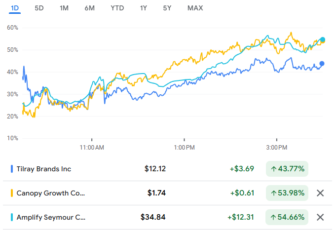 大麻生产商Tilray Brands飙涨44%,Canopy Growth暴涨53%。Amplify Seymour Cannabis ETF飙升超54%,创下该基金有史以来最佳单日表现。