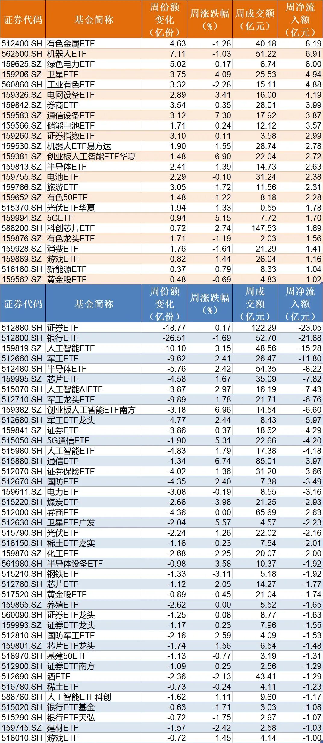 行业主题上看,有色、机器人等ETF被资金看好,而金融相关ETF被资金抛售。