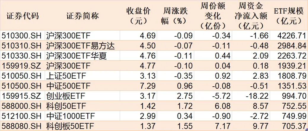 具体ETF方面,规模较大的10只宽基指数ETF本周合计净流出0.13亿元,其中创业板ETF净流出18.22亿元。