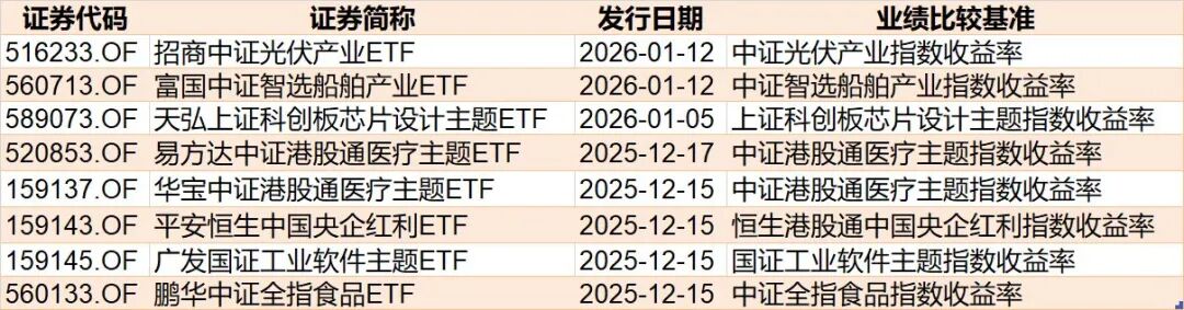 目前有5只ETF披露下周发行,跟踪标的为食品、工业软件、央企红利、港股通医疗等。