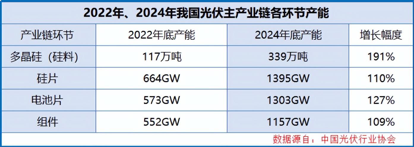2022年底时,我国多晶硅、硅片、电池片、组件各环节产能分别为117万吨、664GW、573GW和552GW。仅仅两年后,这四个环节的产能均实现翻番,并且多是需求的两倍以上。