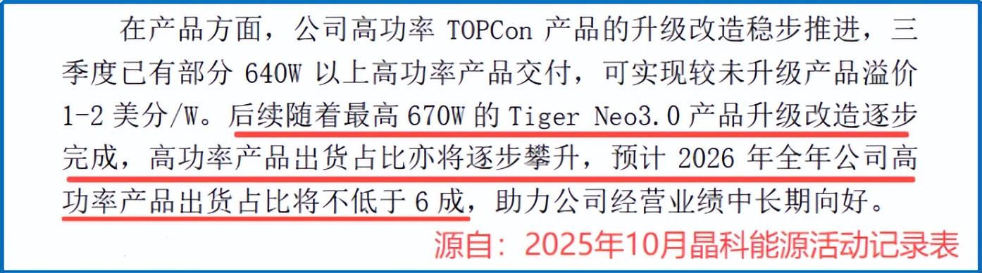 与此同时,晶科能源高功率TOPCon组件产品的升级改造也在稳步推进,2025年第三季度已有部分640W以上高功率产品交付,可实现较未升级产品溢价1-2美分/W。