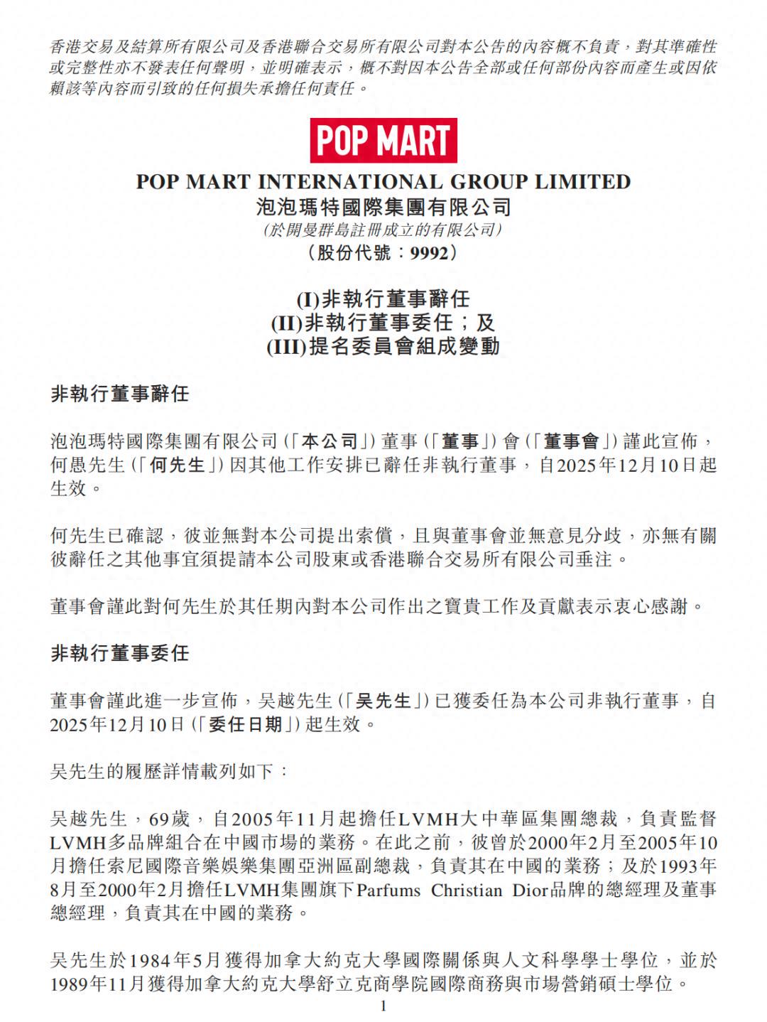 12月10日,泡泡玛特的一则公告在资本市场投下了一粒颇为耀眼的石子:69岁的LVMH大中华区集团总裁吴越,接替黑蚁资本管理合伙人何愚,出任公司非执行董事。
