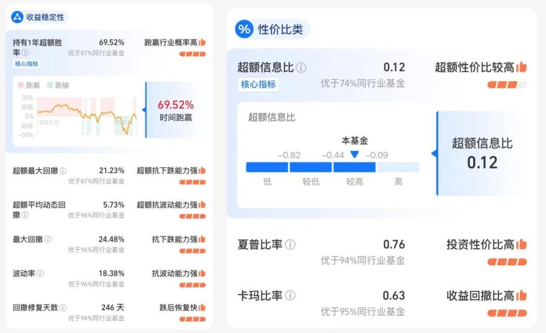 前十大重仓占比36.15%,持股集中度较低。我们看看蚂蚁基金详情页,也有类似的数据分析。收益稳定性上,持有1年超额胜率优于87%同行业基金,跑赢行业概率高;性价比上,通过超额信息比优于74%同行业基金,超额性价比较高。
