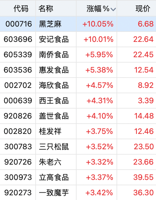 食品板块方面, 黑芝麻、安记食品等涨停,南侨食品、惠发食品等跟涨。