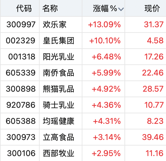 乳业股方面, 皇氏集团2连板,欢乐家涨超13%,阳光乳业涨超6%,此前一度涨停。